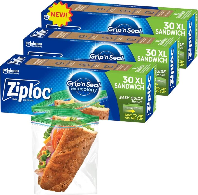 Ziploc XL Sandwich and Snack Bags, Storage Bags for On the Go Freshness, Grip ‘n Seal Technology for Easier Grip, Open, and Close, 90 Bags Total